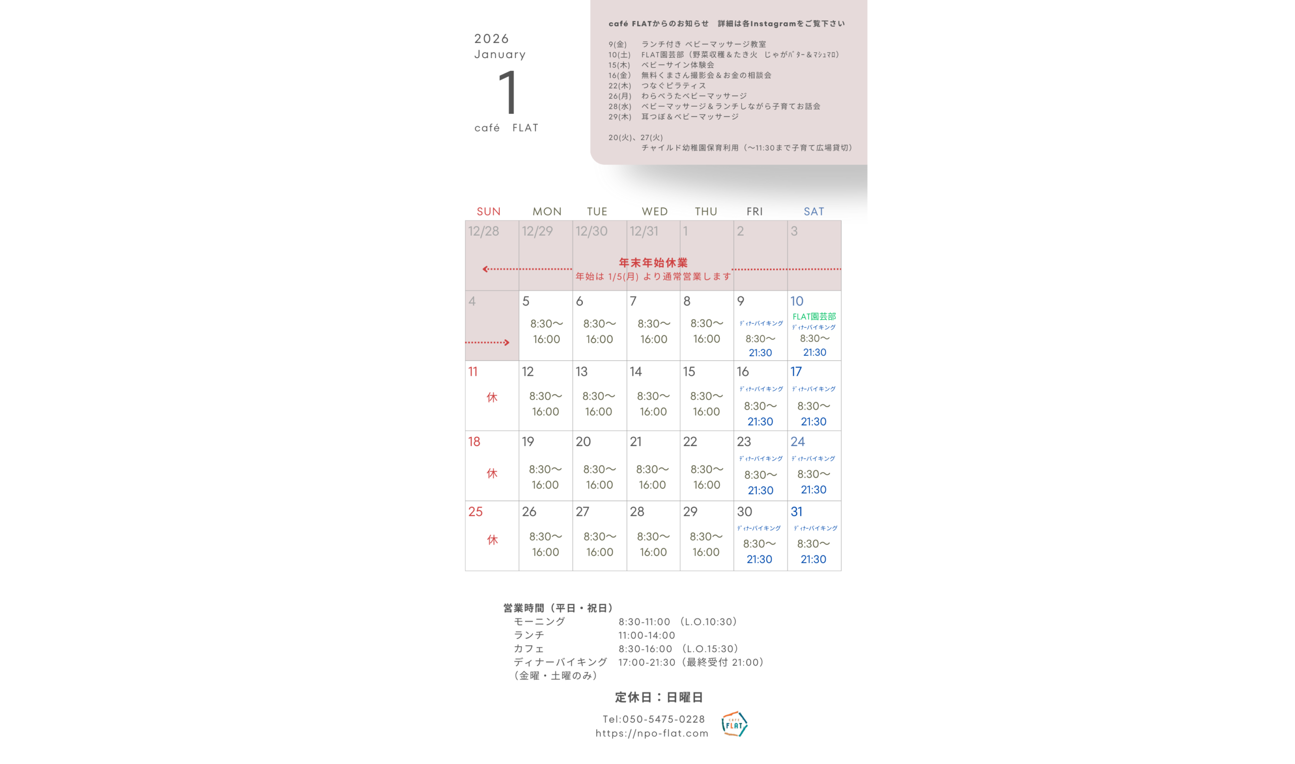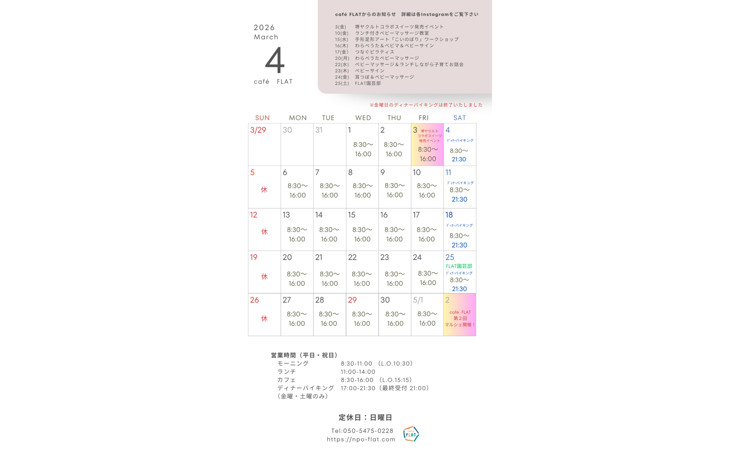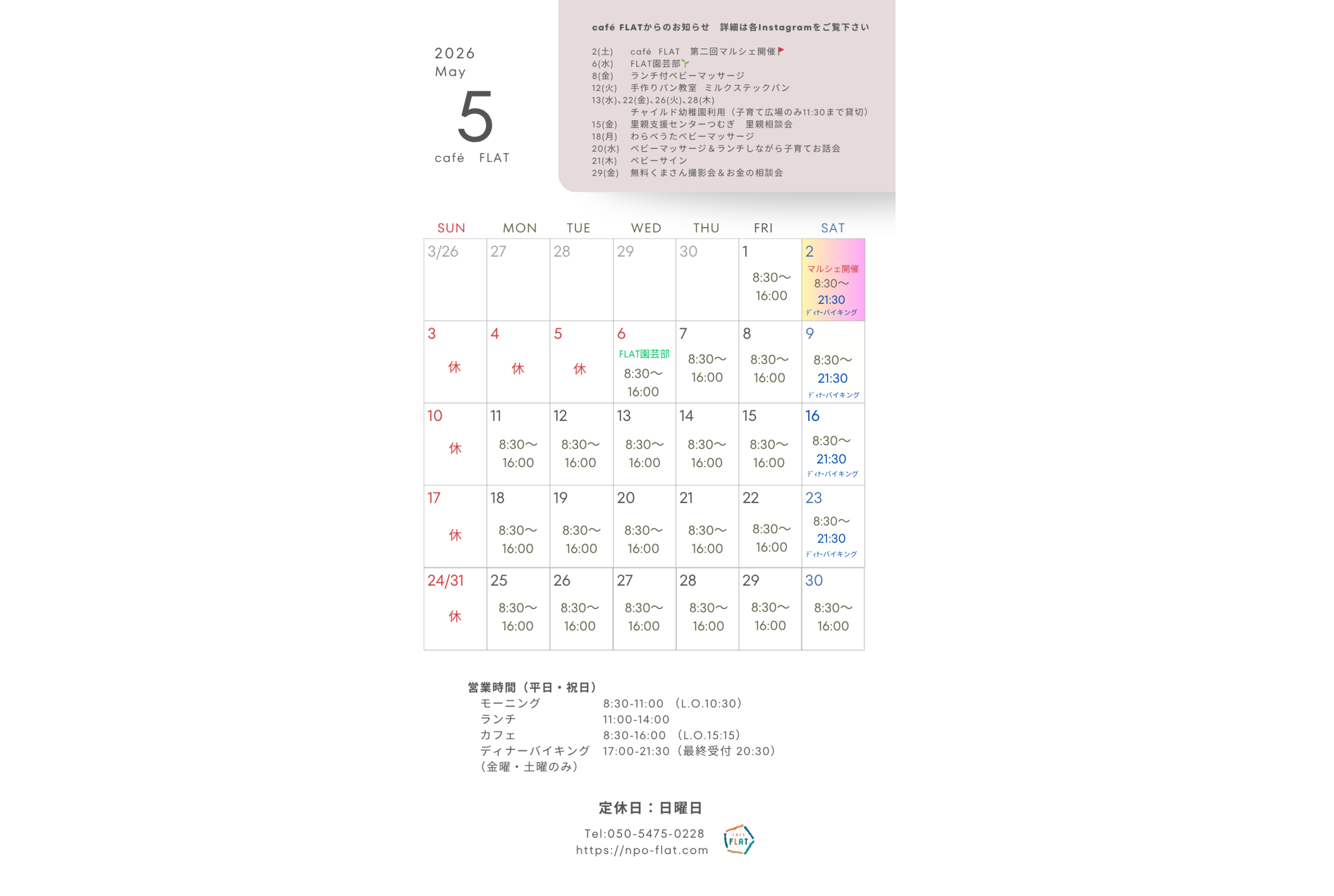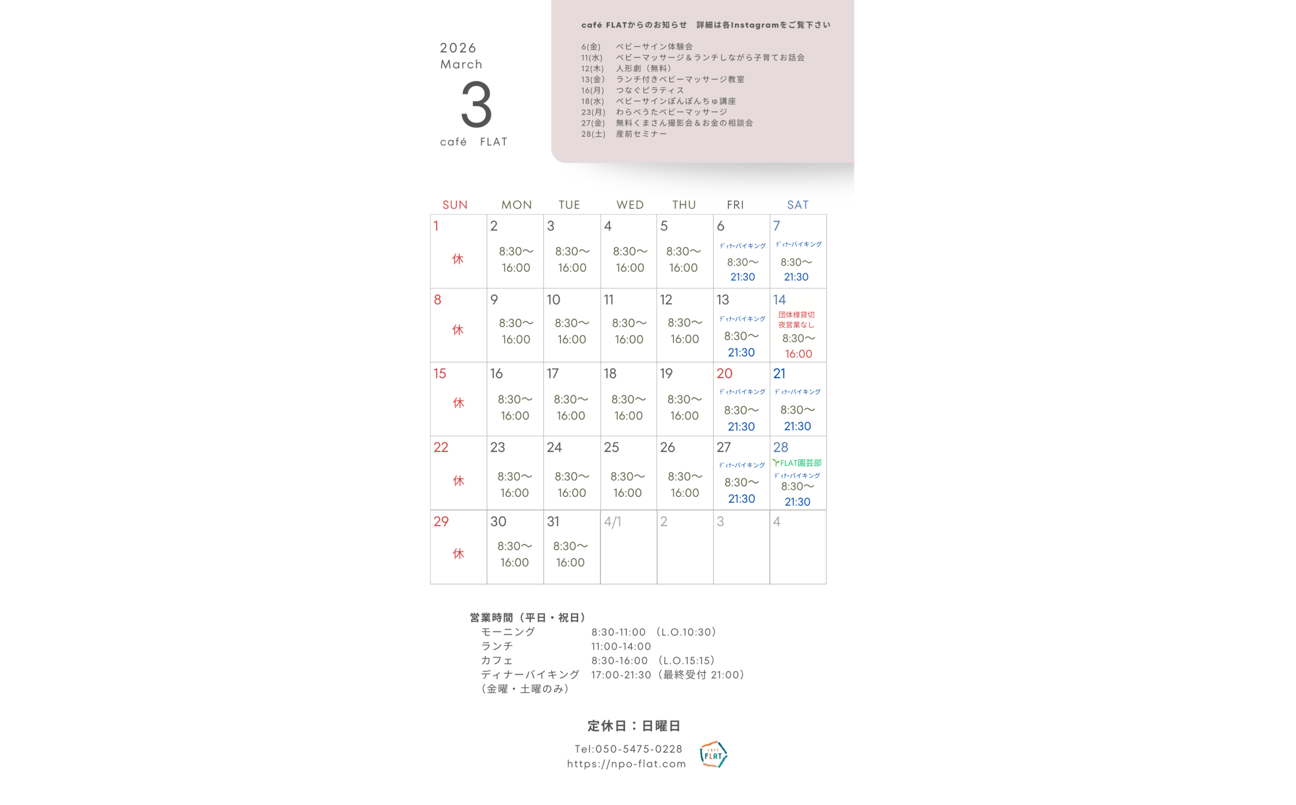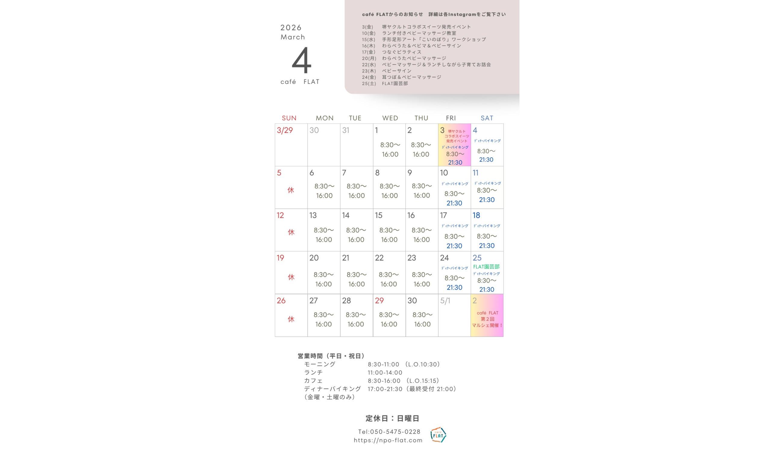 日曜日(その他の休業日はHPやSNSでお知らせします)