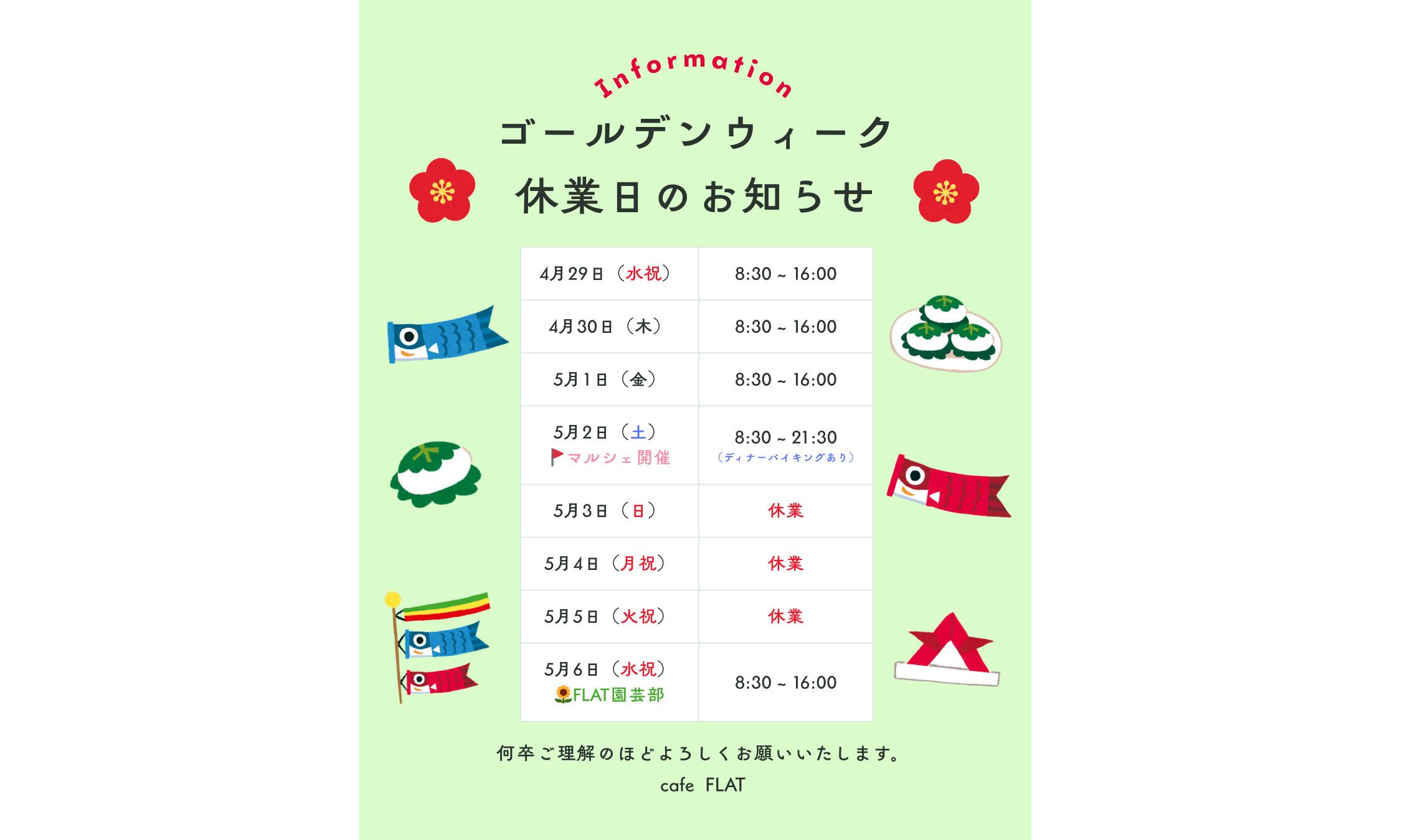 土曜 OPEN 8:30- / CLOSE 21:30 (LO 20:30)