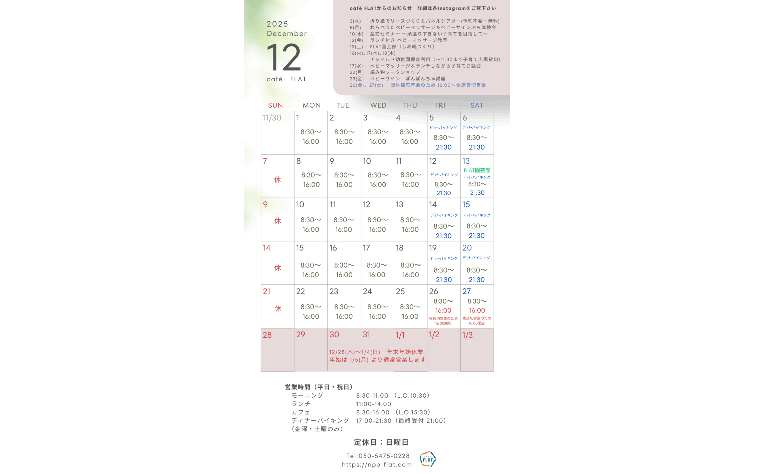 日曜日(その他の休業日はHPやSNSでお知らせします)