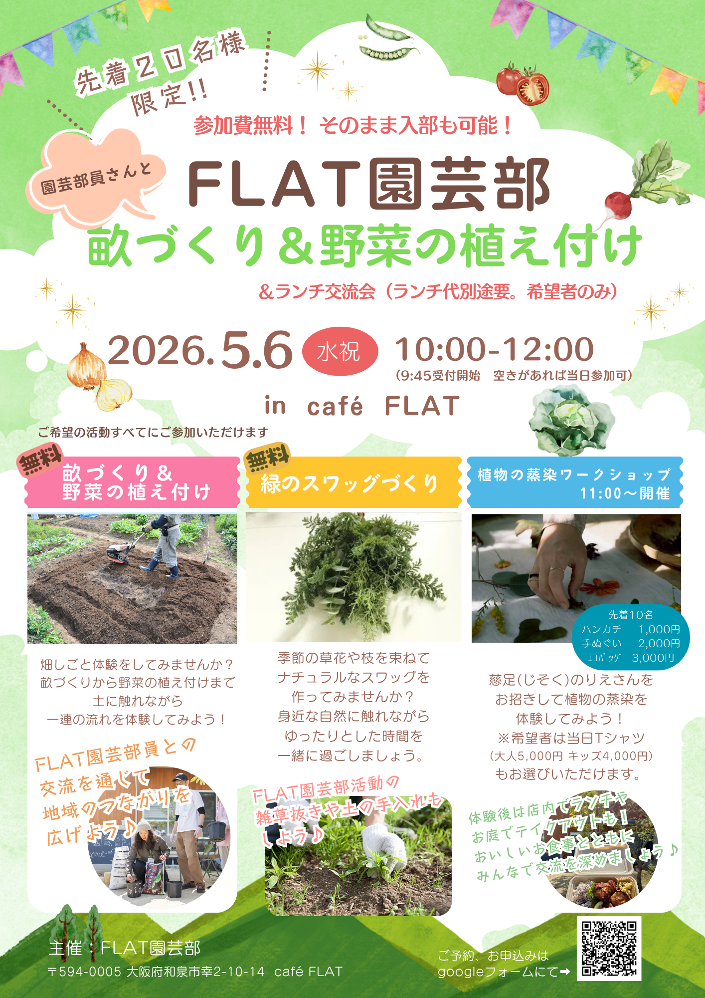 ☆先着20名様限定! 2026年5月6日(水祝) FLAT園芸部 畝づくり&野菜の植え付け、緑のスワッグづくり イベント開催!